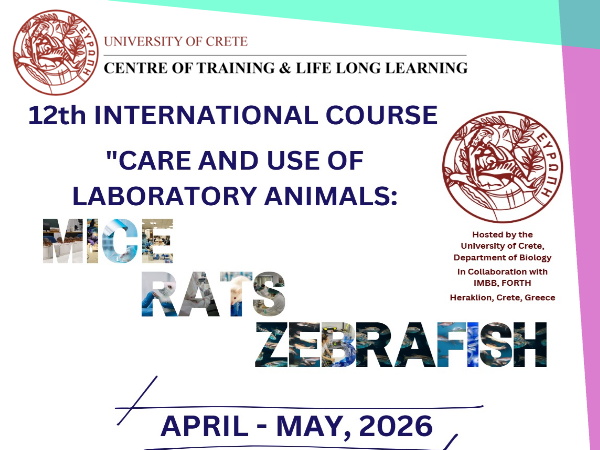 An intensive course on the care and use of laboratory animals (mice, rats and zebrafish) will be organized at the University of Crete (Department of Biology), in collaboration with the Institute of Molecular Biology and Biotechnology, FORTH, in April-May 2026.